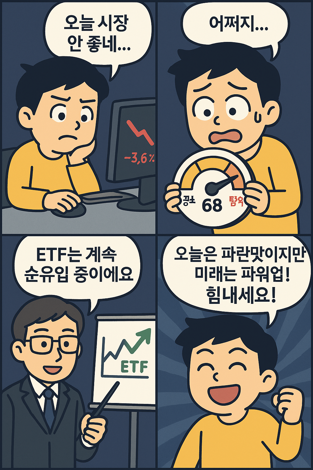 투자자가 시장 하락에 당황하지만 ETF 순유입 소식으로 힘내는 과정을 담은 단순‧경쾌한 4컷 만화.