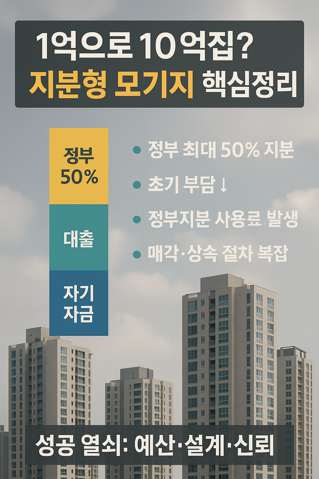 지분형 모기지는 정부가 정책금융기관(HF)과 함께 주택 지분을 공동 보유하도록 지원하는 주택금융 제도다. 정부의 청년 주택 정책 및 내 집 마련 지원책으로 논의되는 이 제도는, 예를 들어 집값 10억원 아파트를 살 때 개인이 자기자본 1억원(10%)만 마련하면 되도록 설계됐다. 이때 정부(주택금융공사)는 나머지 지분의 일부(약 40~50%, 예시 5억원)를 출자하고, 부족분은 은행에서 40%가량(예시 4억원)을 대출받는다. 즉, 정부의 지분 참여로 초기 자금 부담을 크게 줄여줘 무주택 청년·신혼부부 등 실수요자의 내 집 마련 진입장벽을 낮추는 효과가 기대된다.