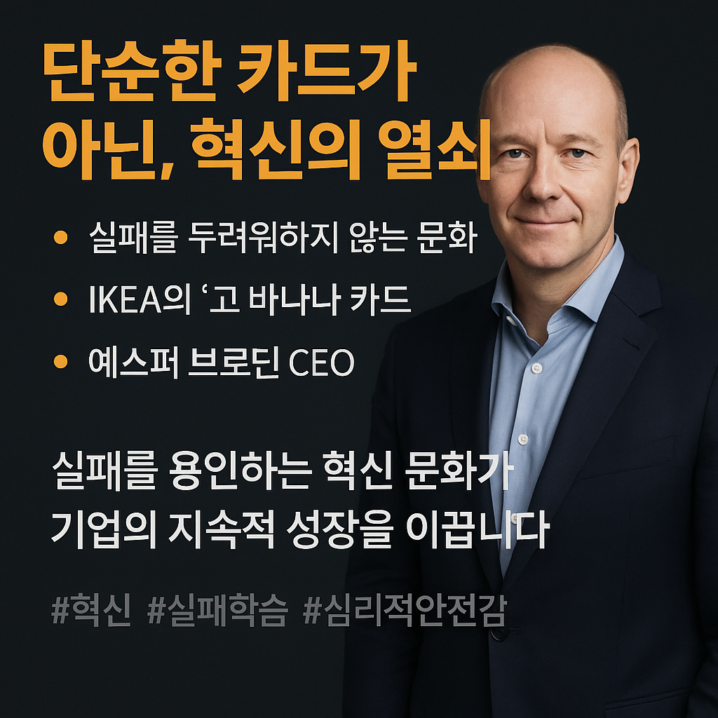 이처럼 '고 바나나 카드'는 단순한 사기 진작용 이벤트가 아닙니다. 이 카드에는 CEO의 서명이 담겨 있어 , 리더가 직접 실패에 대한 책임을 지고 새로운 시도를 장려하겠다는 강력한 메시지를 전달합니다. 이는 실패를 용납하지 않는다는 조직 내의 암묵적인 규범을 깨고, 리더가 직접 그 규범을 재정의하겠다는 선언과 같습니다. 카드 한 장이 조직 구성원들의 행동 양식을 바꾸는 촉매제 역할을 함으로써, 이케아는 혁신을 위한 문화적 기반을 단단히 다지고 있습니다.