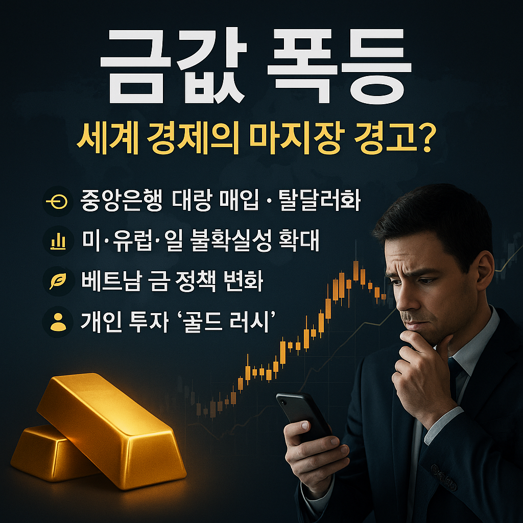 금값 상승의 주요 원인으로는 세계 각국의 중앙은행들의 움직임, 불안정한 세계 경제 상황, 그리고 베트남의 독특한 금 정책 변화가 꼽힙니다. 이 세 가지 요소가 복합적으로 작용하며 금값을 밀어 올리고 있습니다.