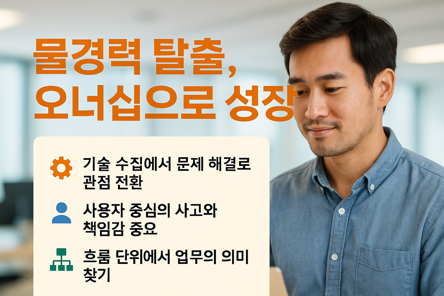 그렇다면 물경력을 탈피하고 문제 중심으로 성장하기 위해 필요한 것은 무엇일까요? 핵심 열쇠는 바로 ‘오너십(Ownership)’ 마인드입니다. 흔히 오너십이라고 하면 “주인의식” 또는 “책임감” 정도로 이해하기 쉽지만, 여기서 말하는 오너십은 단순히 회사에서 더 일 떠맡고 희생하라는 뜻이 아닙니다. 내가 맡은 프로젝트나 제품을 마치 내 것처럼 여기고 능동적으로 문제를 해결하려는 태도를 의미합니다. 오너십을 갖춘 개발자는 주어진 요구사항만 달성하고 끝나는 것이 아니라, 그 일이 가지는 맥락과 궁극적인 목표까지 고민합니다. 내가 만든 기능 하나라도 온전히 내가 만든 제품처럼 생각하며, 그 기능이 사용자에게 어떤 영향을 줄지 끊임없이 자문합니다. 만약 서비스에 장애나 버그가 발생했다면 단순히 오류를 고치는 데 그치지 않고, “왜 이런 문제가 발생했지? 어떻게 하면 다시는 같은 문제가 생기지 않을까? 이번 장애로 사용자들은 어떤 불편을 겪았을까?”를 깊이 고민합니다. 이러한 자세 덕분에 문제를 미연에 방지하고 제품의 완성도를 높이는 데 기여하게 되죠.