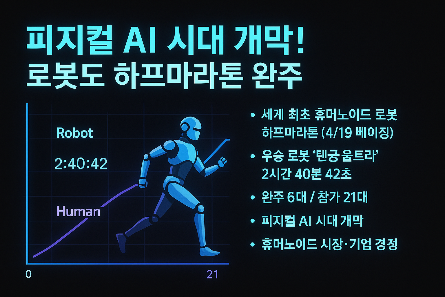 - 참가 규모: 휴머노이드 로봇 21대, 인간 러너 약 9천 명