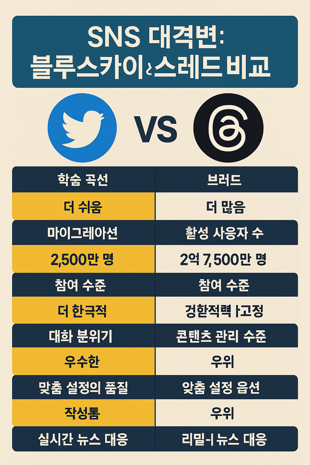 안녕하세요! 오늘은 X(옛 트위터) 시대가 저물어 가는 요즘, 새로운 소셜 미디어 플랫폼을 찾고 계신 분들을 위해 준비했습니다. “블루스카이 vs 스레드” 비교 후기를 2025년 최신 기준으로 정리해보았는데요. 직접 사용해보고 느낀 생생 꿀팁까지 대방출하니, 놓치지 마시길 바랍니다!