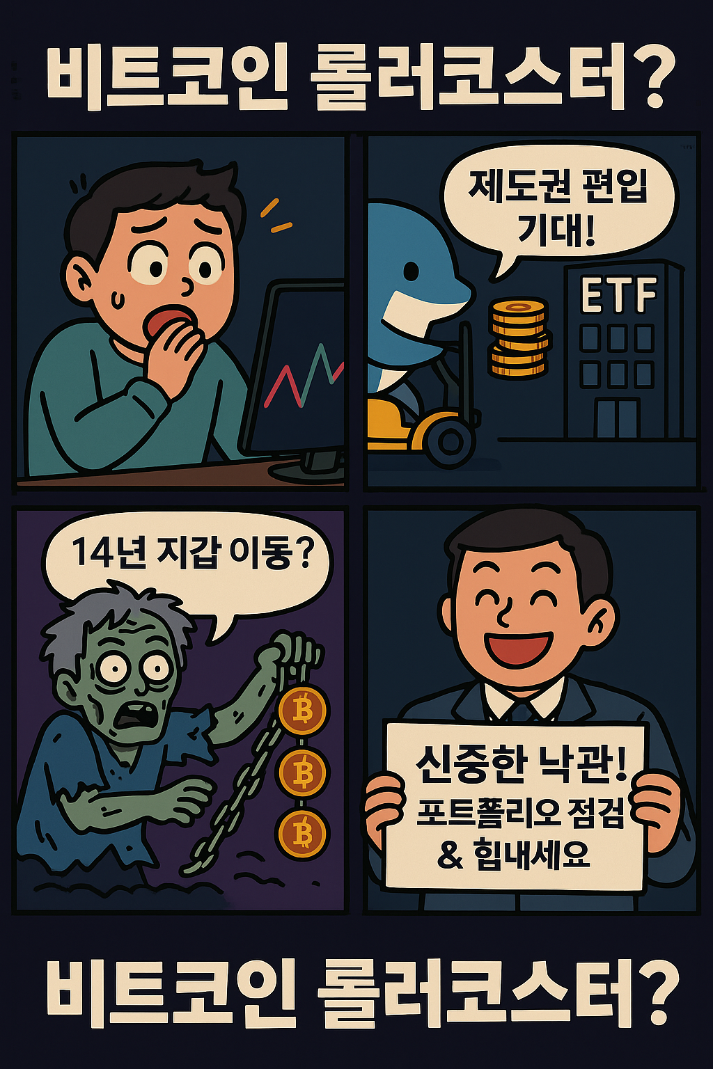 오늘은 비트코인 10만 달러 공방을 ‘희화 4컷 만화’로 담아보았습니다. 다크한 배경 위에 유쾌한 캐릭터가 시장의 희비를 생생히 압축했어요.