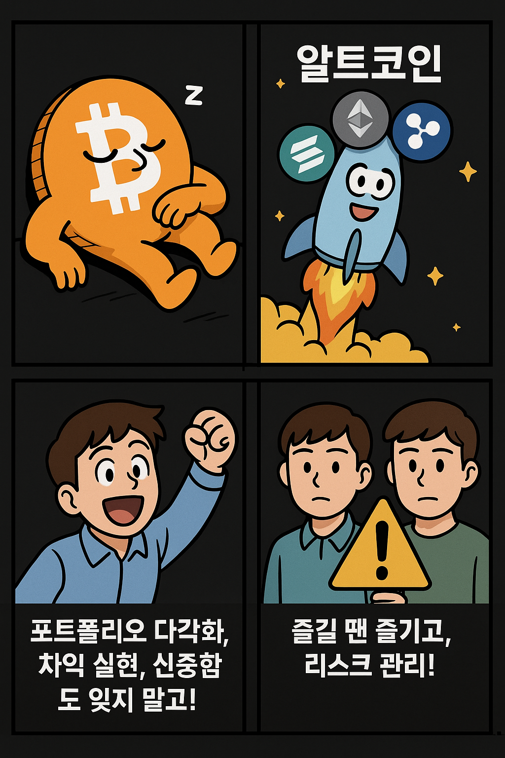 | 4컷 만화로 살펴본 7월 25일 암호화폐 시장 – 혼조장 속 기회와 방패 (2) | 2025.07.25 |