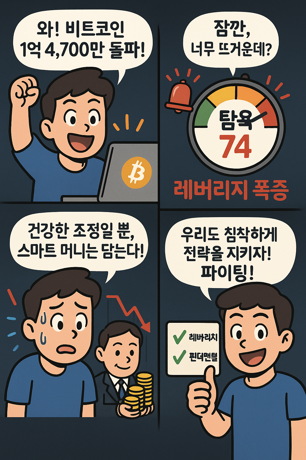 - 2컷 : 탐욕 지수 74 🚨 → 레버리지 폭증 경고