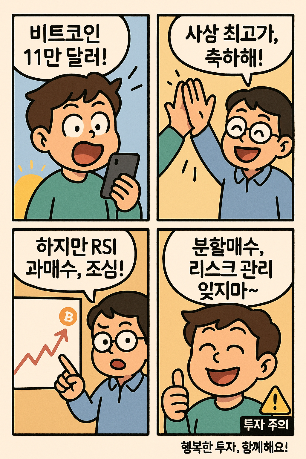 투자 시장은 언제나 “기대”와 “경계”가 공존합니다. 4컷 만화가 전하는 메시지처럼, 기쁜 순간에도 리스크 관리를 잊지 않는다면 변동성 높은 암호화폐 시장에서도 ‘행복한 투자’를 이어갈 수 있습니다.