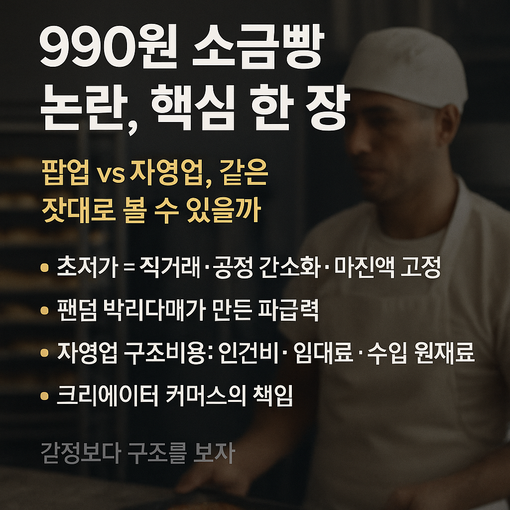 소비자들은 "비싸서 못 사겠다"고 느끼지만, 자영업자들은 "남는 게 없다"고 하소연하는 이유가 여기에 있습니다. 팝업스토어는 단기적인 이벤트 성격이 강해 화제성과 마케팅 효과를 노리지만 , 일반 고정 점포는 매달 발생하는 임대료, 인건비, 공과금 등 고정비를 감당하며 꾸준히 생존해야 합니다. 한 제빵 자영업자는 "유명 유튜버는 990원에 파는데, 여기는 왜 이렇게 비싸냐"는 손님의 항의를 들었다며 억울함을 토로하기도 했습니다.