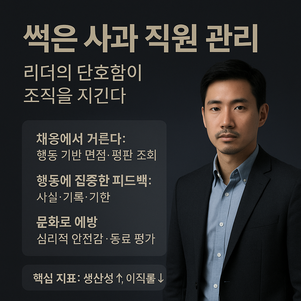한 명의 썩은 사과를 방치하는 것은 조직 전체를 무너뜨리는 것과 같습니다. 따라서 썩은 사과를 발견하는 데 집중하기보다, 사과 상자 전체가 썩지 않도록 건강한 토양과 튼튼한 뿌리를 만드는 리더가 되어야 합니다. 이는 채용 단계부터 협업을 중시하는 문화를 구축하고, 문제 발생 시에는 감정적 대응이 아닌 단호하고 객관적인 원칙을 적용하는 데서 시작됩니다. 이러한 리더의 용기와 노력이 결국 조직 전체를 보호하고 성장시키는 가장 확실한 투자가 될 것입니다.
