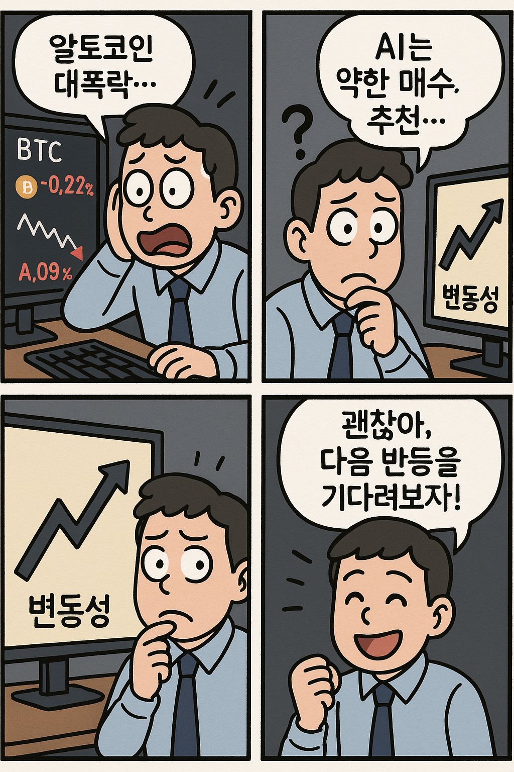 첫 번째 칸에서 급락 차트를 보고 놀라는 주인공의 모습이 보이시죠? 실제로 SOL, ADA 같은 주요 알트코인이 짧은 시간에 크게 흔들렸습니다. - “AI는 약한 매수 추천…”