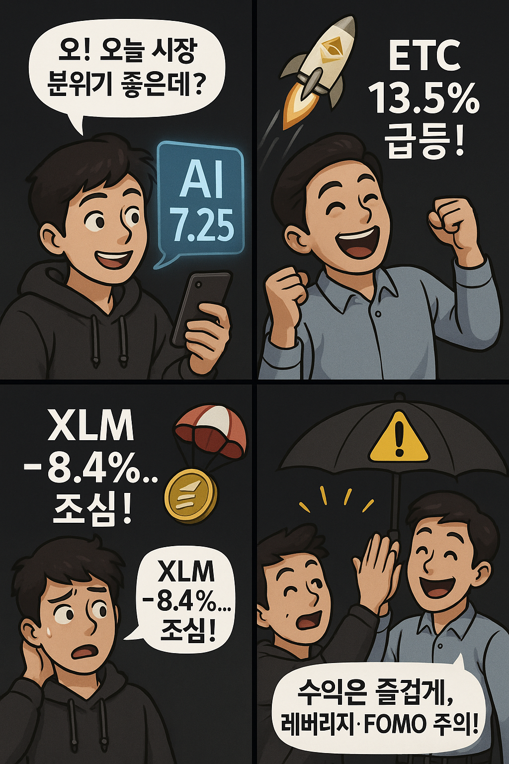 - 셋째 컷: 주인공이 XLM –8.4% 급락 뉴스에 놀라는 장면. 코인은 낙하산을 단 채 내려오고, 투자에선 항상 변동성을 경계해야 함을 상기시킵니다.