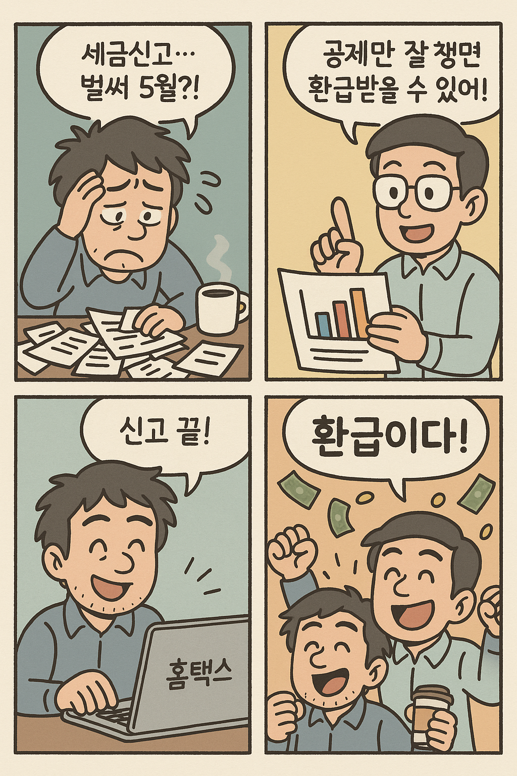 5월은 종합소득세 신고의 달입니다. “세금”이라는 단어만 들어도 머리가 지끈하지만, 제대로만 하면 환급도 받고 내 돈도 지킬 수 있다는 사실! 오늘은 아래 4컷 만화와 함께 종합소득세 신고 꿀팁을 쉽고 빠르게 알려드릴게요.