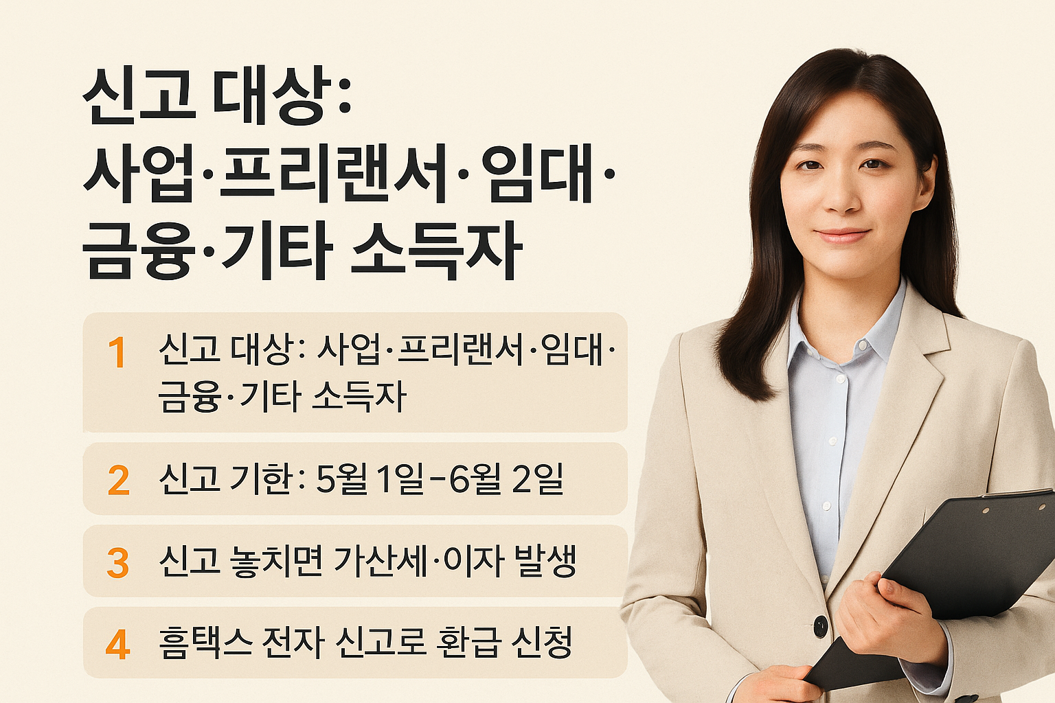 - 개인사업자 · 자영업자 (사업소득) – 가게 운영, 온라인 판매, 프리랜서 등 사업 활동으로 소득이 있었다면 무조건 신고 대상입니다. 규모와 상관없이 사업을 통해 번 소득은 모두 신고해야 해요. 음식점 사장님, 동네 미용실 운영자부터 1인 기업, 유튜버까지 모두 해당됩니다.