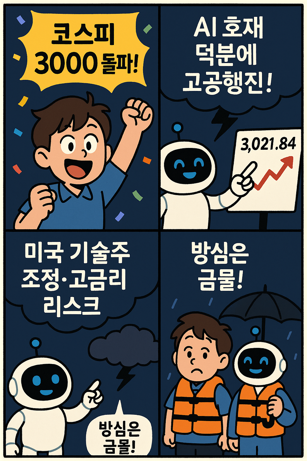 2025년 6월 20일, 코스피가 3,021.84로 마감하며 3,000선을 넘어섰습니다. 정부의 AI 산업 육성 정책, 외국인 투자 확대, 밸류업 기대감이 랠리를 견인했죠. 그러나 미국 시장에서는 기술주 조정과 고금리 우려가 커지고 있습니다.
