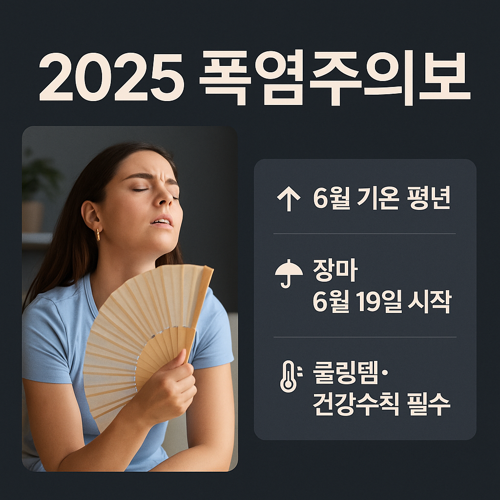 폭염주의보 2025 대비 필수 가이드! 기상청 3개월 전망으로 보는 장마 예상 시작일과 기간, 폭염 건강수칙과 온열질환 예방 방법, 선풍기·냉감 의류 등 필수 쿨링템 추천까지. 무더위 완벽 대비법 총정리!