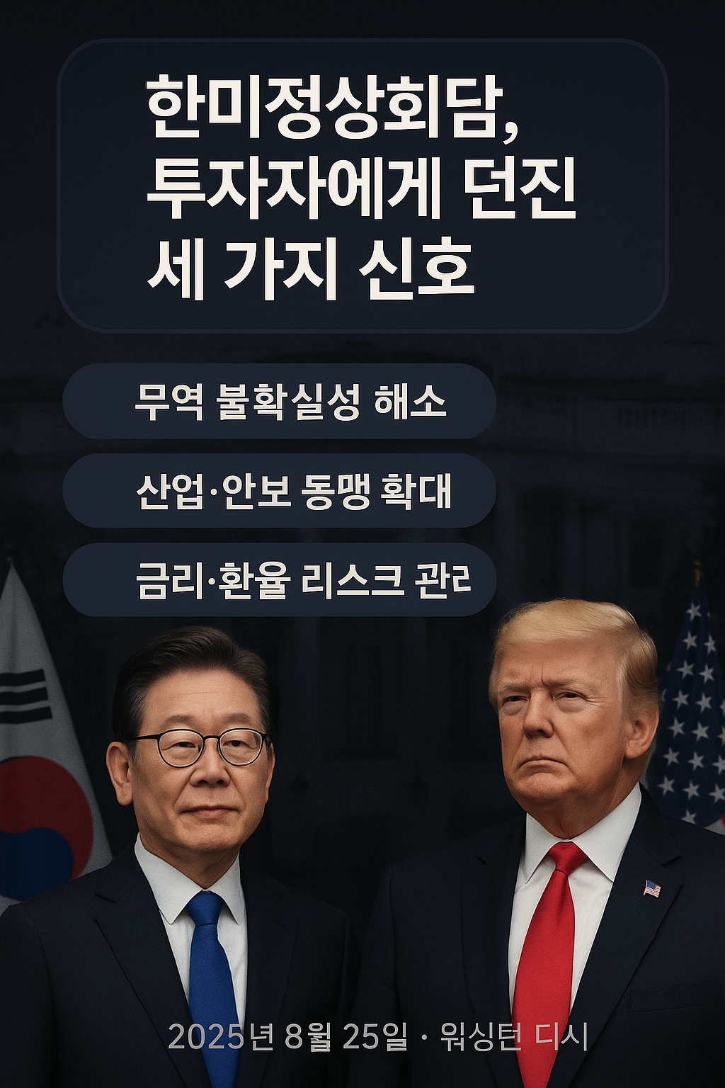 2025년 8월의 한미정상회담은 투자자들에게 두 가지 명확한 메시지를 전달했습니다. 첫째, 불확실성 감소와 산업 협력 확대를 통해 한국 경제에 새로운 긍정적 모멘텀이 생겨났다는 점입니다. 둘째, 금리 인하와 원화 강세라는 또 다른 환율 리스크가 남아 있어, 현명한 대응 전략이 필수적이라는 점입니다.