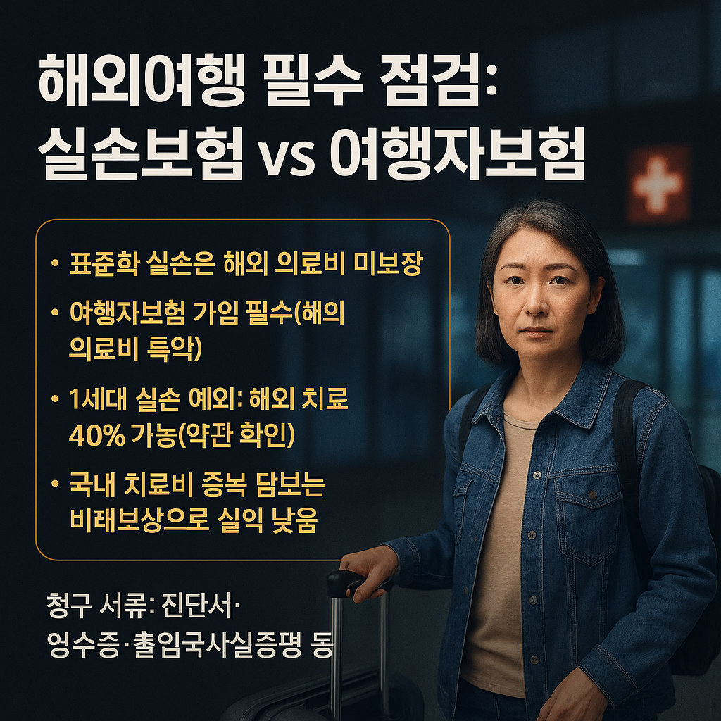 | 구분 | 표준화 실손보험 (2009.10 이후) | 1세대 실손보험 (2009.09 이전) | 해외여행자보험 (해외 의료비 특약) |