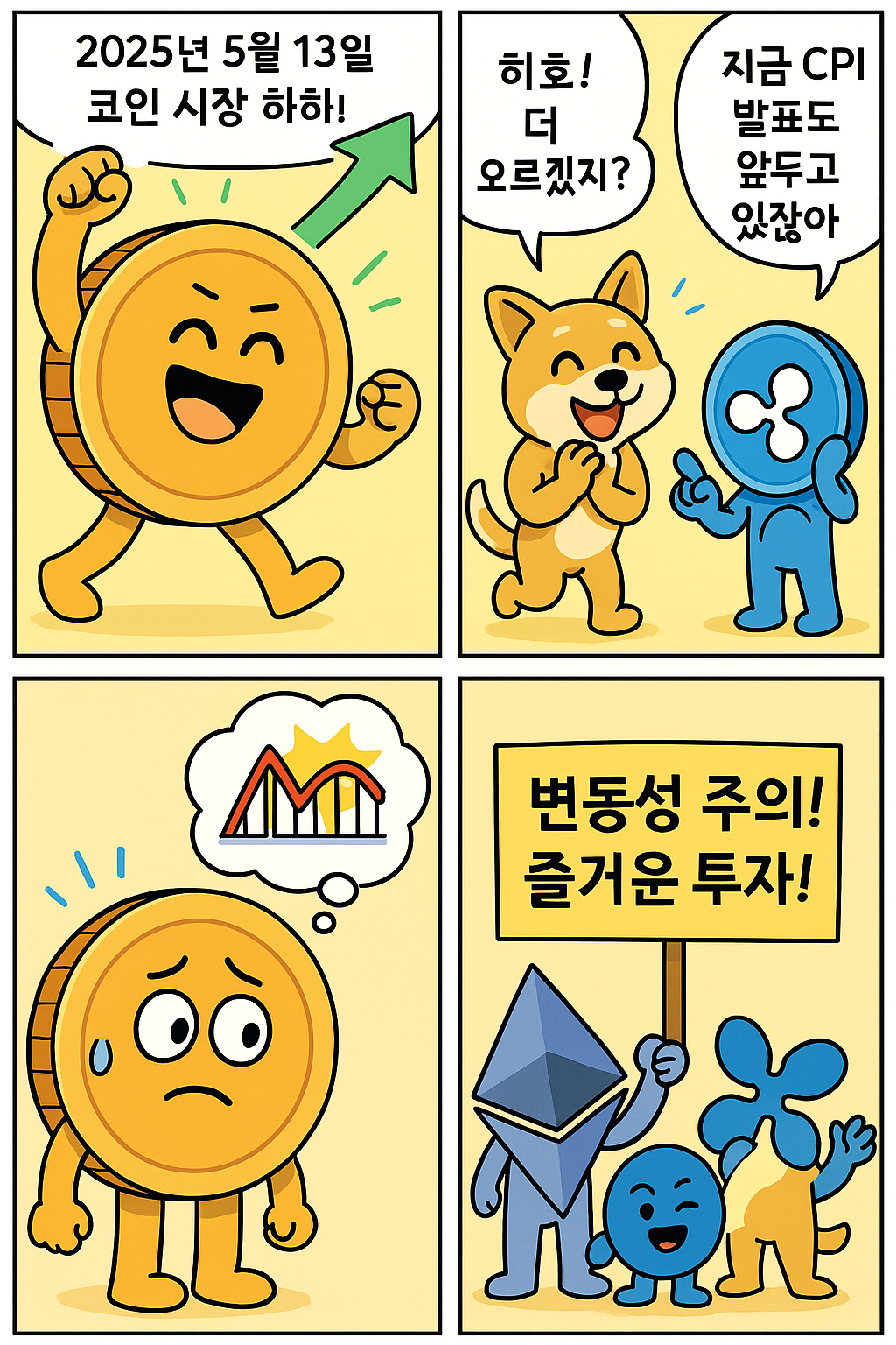 | 4컷 | 이더리움·알트코인 친구들이 “변동성 주의! 즐거운 투자!” 팻말 📢 | 리스크 관리 + 긍정적 태도 유지 |
