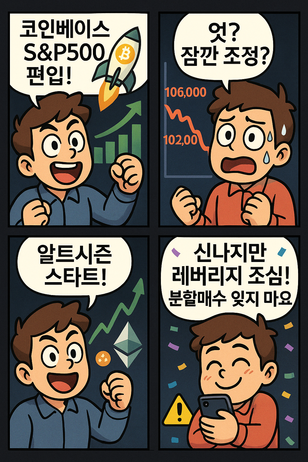 안녕하세요! 오늘은 코인베이스 S&P500 편입과 비트코인 10만 달러 공방 이슈를 유쾌하게 담아낸 희화 4컷 만화로 시장을 정리해 보았습니다. 투자 스트레스는 내려놓고, 가벼운 마음으로 핵심 포인트만 쏙쏙 챙겨 가세요.
