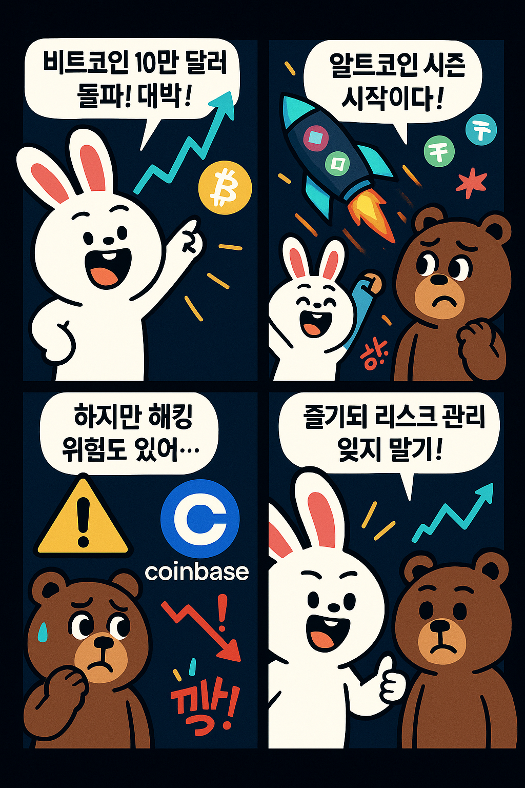 아래 네 컷 만화는 ‘희화와 공감’을 목표로, 2025년 5월 19일 현재 암호화폐 시장의 희망(강세·알트 시즌)과 경계(해킹·변동성)를 동시에 담았습니다.