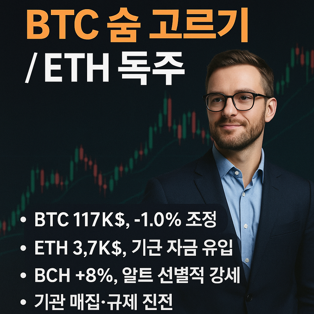 • 알트코인: 비트코인캐시(BCH)가 +8.05%, 수이(SUI)가 +7.02% 상승하는 등 일부 알트코인들은 강한 상승세를 보였습니다. 그러나 전반적으로 "알트코인 조정 국면 진입"이라는 뉴스도 많아, 전반적인 알트코인 시즌보다는 선별적인 강세가 나타나고 있습니다. 리플(XRP)은 -0.61% 하락하며 약세를 보였고, "XRP 데스 크로스 발생"이라는 뉴스도 있어 기술적 약세 신호에 유의해야 합니다. 볼린저 밴드 관점에서 비트코인은 현재 밴드 중앙선 부근에서 움직이며 변동성을 확대할 가능성이 있습니다. 이동평균선은 단기적으로 하향 이탈 조짐을 보일 수 있으나, 중장기 이동평균선 위에 머무른다면 여전히 상승 추세는 유효하다고 볼 수 있습니다.