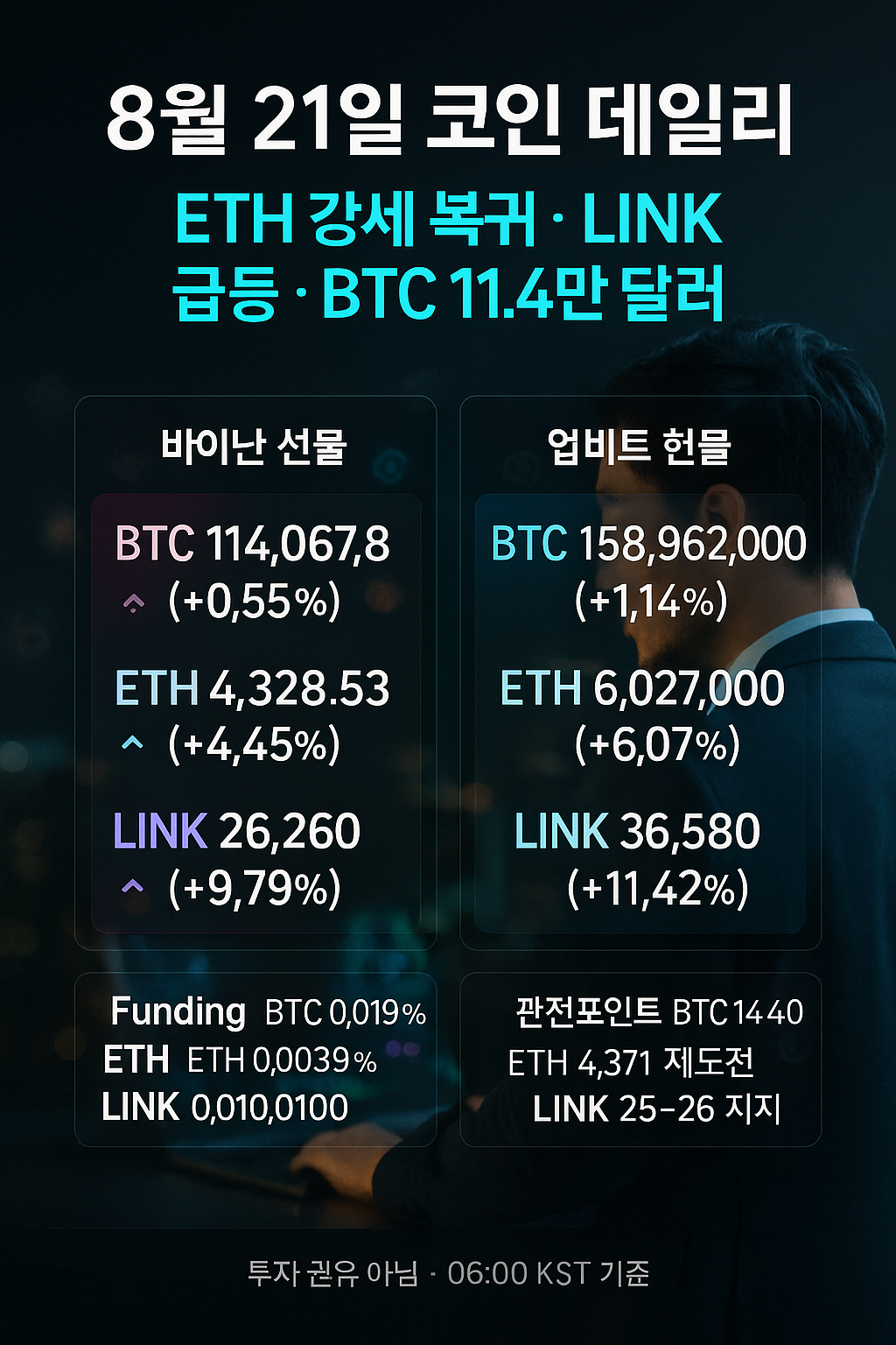 - Binance 선물: BTC 114,067.8(+0.55%) / ETH 4,328.53(+4.45%) / LINK 26.260(+9.79%)