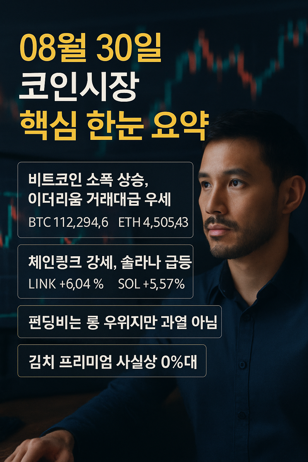 2025년 8월 30일 코인시장 종합 리포트: 김치 프리미엄 사실상 제로, ETH 선물 거래량 우위, LINK 모멘텀 확산