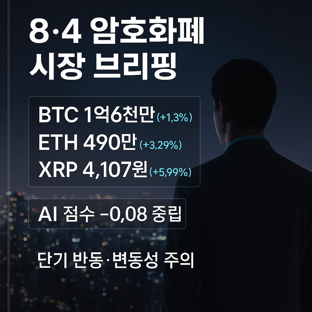2025년 8월 4일 월요일 아침, 암호화폐 시장이 전반적인 상승세로 한 주를 시작했습니다. 지난주 다소 주춤했던 시장은 저가 매수세가 유입되며 비트코인을 포함한 주요 알트코인들이 일제히 반등하는 모습을 보이고 있습니다. 특히 리플(XRP), 스텔라루멘(XLM) 등 특정 종목의 강세가 두드러집니다.