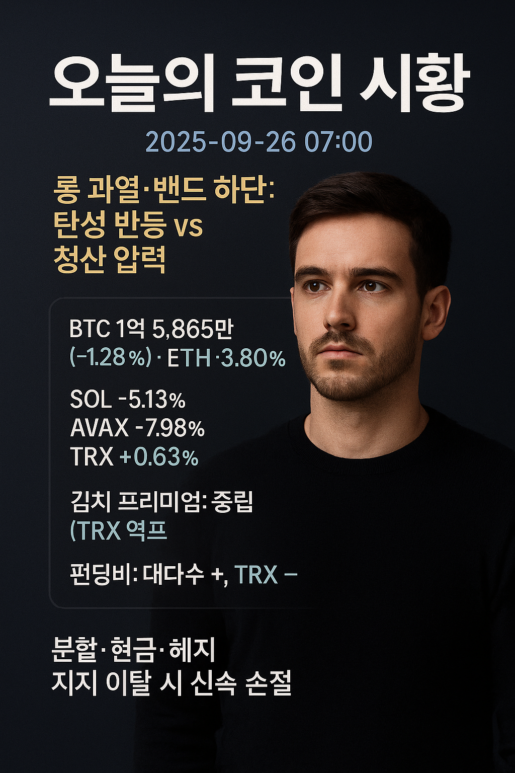 오늘 장은 “롱 과열 속 하방 변동성” 구조가 핵심입니다. 김치 프리미엄은 중립, TRX의 역프리미엄/음수 펀딩처럼 부분 역행 시그널만 보일 뿐, 시장 전체는 방어 기조가 합리적입니다. 지지/저항을 수치로 규율화하고, 분할·현금·헤지로 체력 보존에 집중하세요. 반등은 있을 수 있으나 짧고 턴오버가 빠른 장이므로, 이익 실현의 속도가 생존을 좌우합니다.