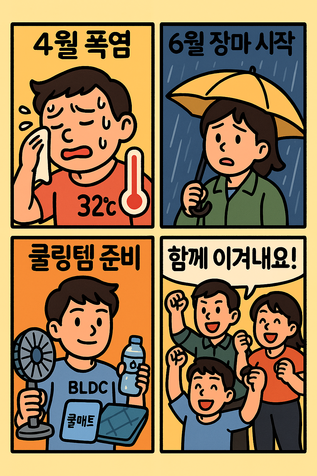 올해는 4월에 이미 폭염주의보가 발령되고 6월엔 장마가 예고돼 있죠. “무더위+장마” 콤보에 지치기 전에, 귀여운 4컷 만화로 핵심 포인트만 쏙쏙 정리했습니다!
