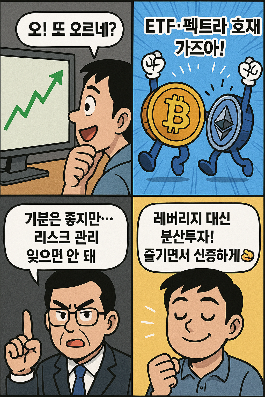안녕하세요! 오늘은 암호화폐 시장의 호재(비트코인 ETF, 이더리움 펙트라 업그레이드 등)를 유쾌하게 풀어낸 4컷 만화를 준비했습니다. 상승장일수록 들뜨기 쉽지만, 현명한 투자자는 항상 리스크 관리를 잊지 않죠. 만화를 통해 핵심 메시지를 정리해볼까요?