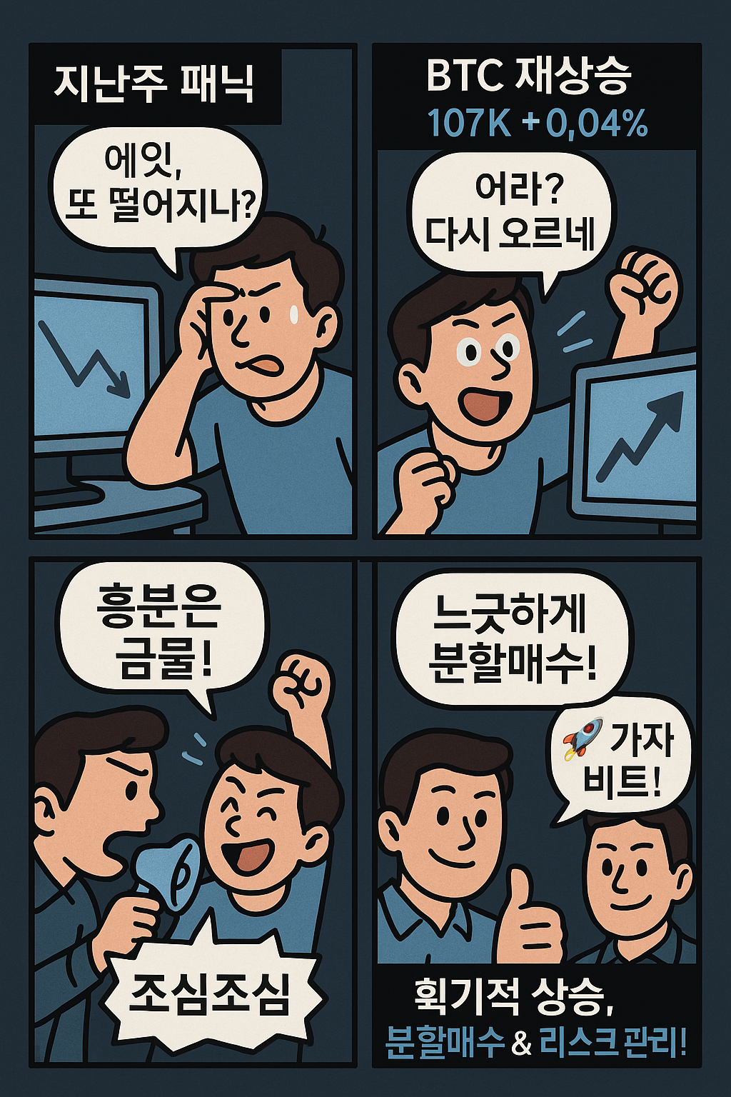 새벽 차트가 화답했습니다. 10만7천달러선 재탈환! 그러나 숫자에만 들뜨면 위험합니다.