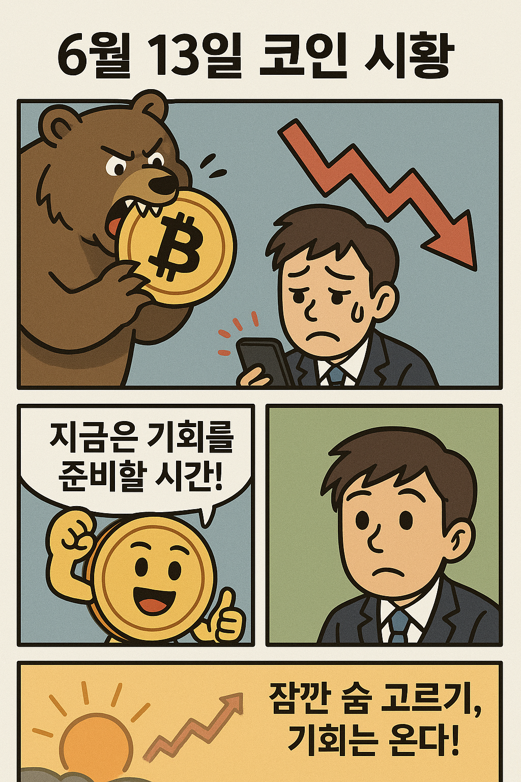 6월 13일 새벽, 글로벌 암호화폐 시장은 또 한 번 시험대에 올랐습니다. 비트코인은 24시간 기준 –1.8%, 알트코인들도 2~6% 하락하며 투자자들의 마음을 무겁게 만들었죠. 하지만 숫자만 보고 낙담하기엔 아직 이르다는 것, 오늘 준비한 희화 4컷 만화에 담아 보았습니다.