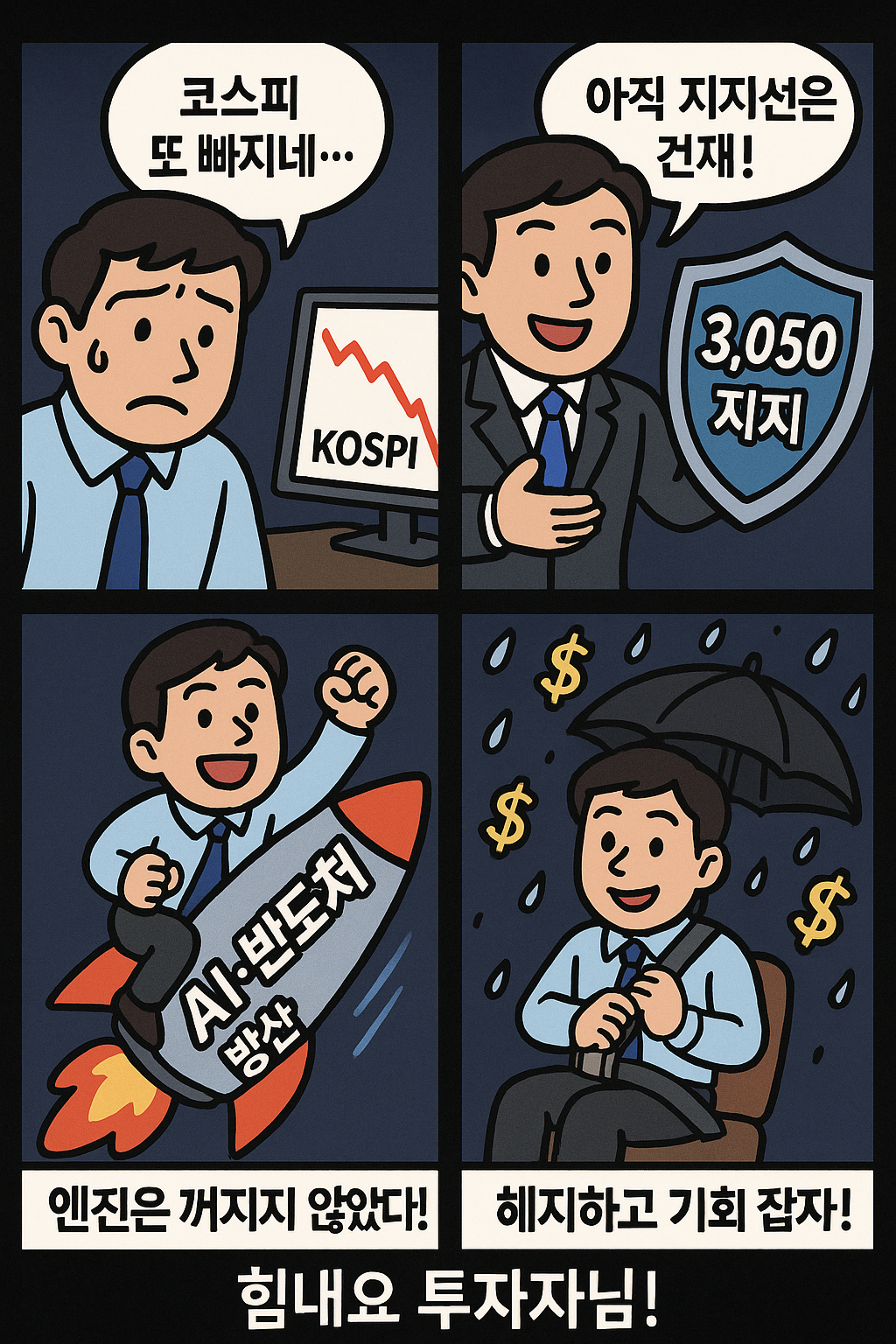 아래 희화 4컷 만화는 변동성 속에서도 희망과 실전 전략 을 놓치지 말자는 메시지를 담고 있습니다.