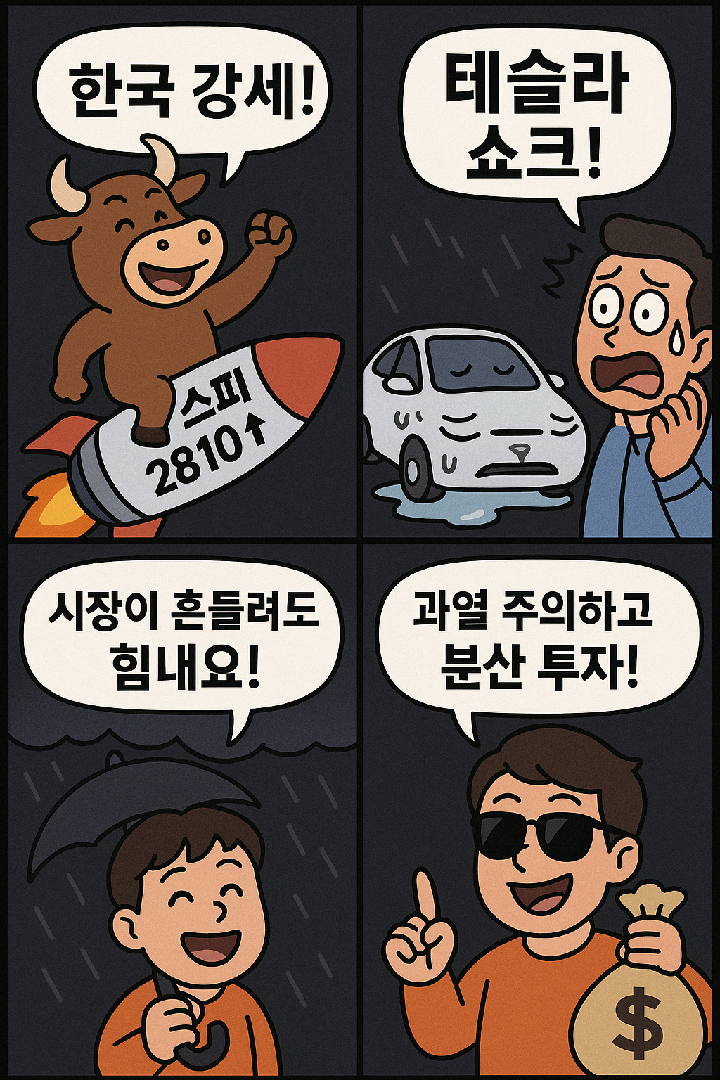 오늘은 “한국 강세 vs 테슬라 쇼크”라는 극단적 온도 차를 담은 4컷 만화를 준비했습니다. 변동성이 클수록 감정 조절이 중요하다는 메시지를 재치 있게 담았으니, 아래 이미지를 먼저 감상해 보세요.