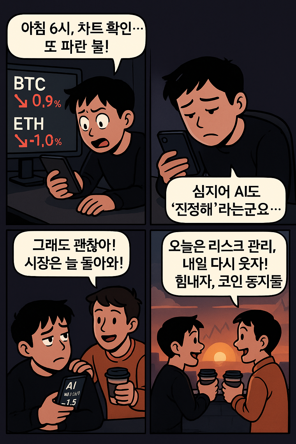 오늘 아침 6시, 차트를 켜자마자 또다시 파란 불이 눈을 뿌옇게 만들었습니다. 비트코인은 –0.9 %, 이더리움은 –1.0 % 하락, AI 매수점수는 –1.5를 기록하며 “진정해”라는 메시지를 던졌습니다. 하루를 시작하기엔 다소 살벌한 숫자들이죠.