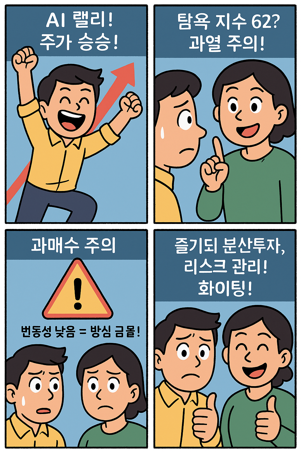 오늘 공개한 4컷 만화는 AI 주도 상승장 속 과열 신호를 쉽고 가볍게 전달하려고 만들었습니다.